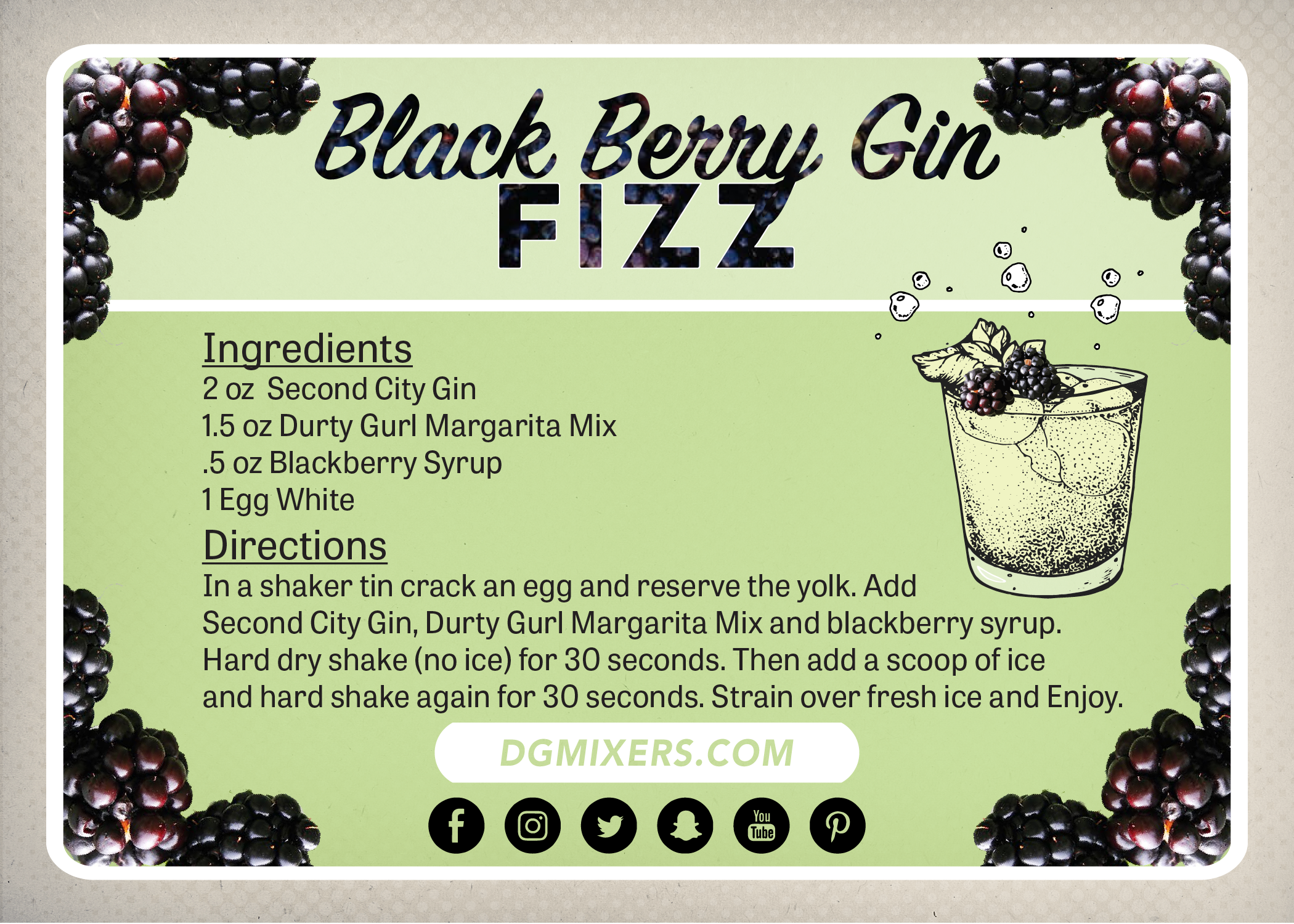 In a shaker tin crack an egg and reserve the yolk. Add Second City Gin, Durty Gurl Margarita Mix and Blackberry Syrup. Hard dry shake (no ice) for 30 seconds. Then add a scoop of ice and hard shake again for 30 seconds. Strain over fresh ice and Enjoy.